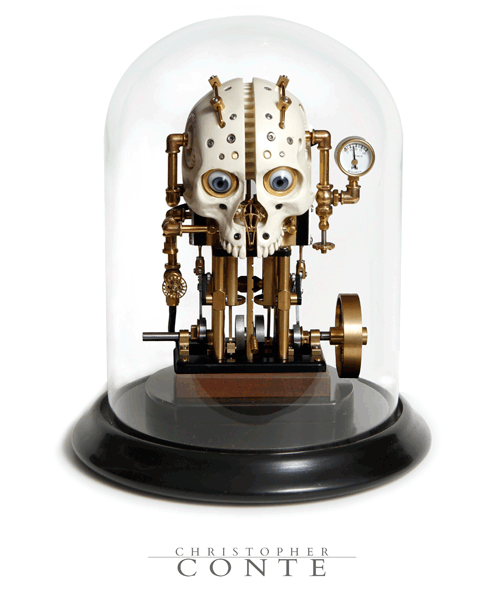 ‘Vapor da Consciência’ por Christopher Conte é uma escultura inspirada em energia cinética, de um crânio que alimentado por um motor a vapor em miniatura. Conte é especializado em esculturas biomecânicas e tem qualificações incomuns que fazem dele único em sua forma de arte. Antes de se tornar um artista em tempo integral, ele passou 16 anos fazendo próteses para amputados.